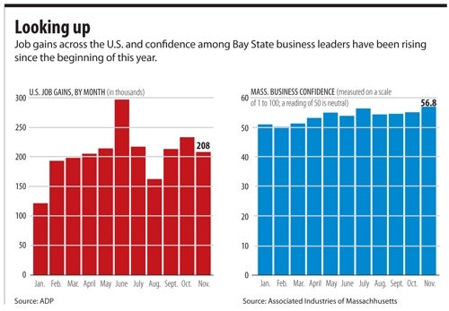 Business confidence is up in Massachusetts. Business leaders’ faith in business conditions reached its highest level of the year in November, and its highest since April 2012, according to Associated Industries of Massachusetts (AIM), which has been measuring business confidence each month for 23 years. What’s even more encouraging is that business leaders have more faith in what lies ahead over the next six months than in what they’re seeing today. “It is surprising that problems in the global economy — (such as) recession or near-recession in Europe and Japan, and slowing growth in China — are not enough to put a damper on these expectations,” said Fred Breimyer, an economist at the Federal Deposit Insurance Corp. who serves on AIM’s board of economic advisors.