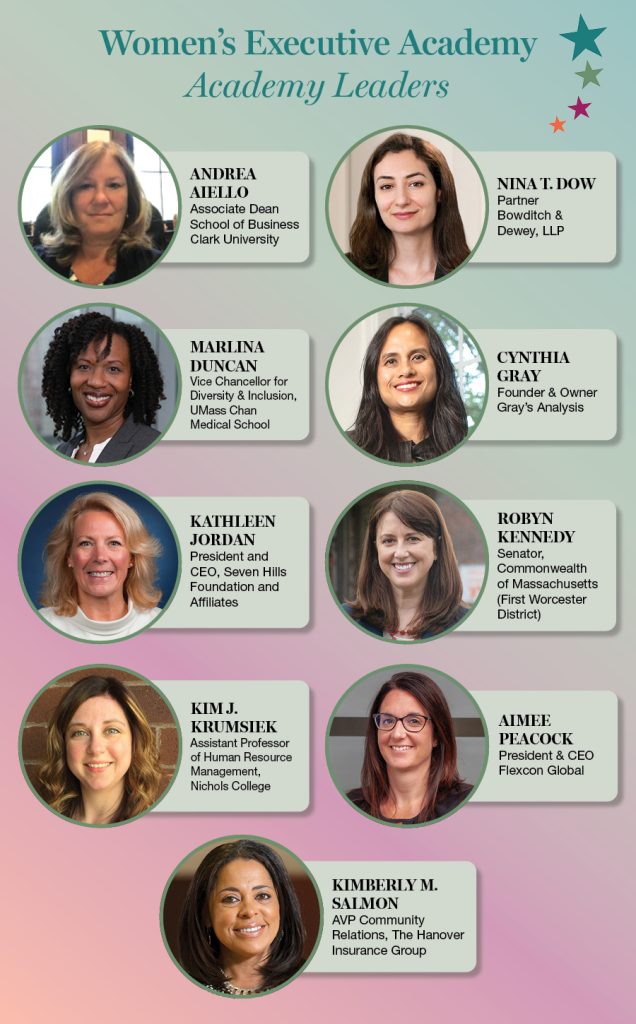 Eligibility: The Women’s Executive Academy is open to all women. All of the sessions will be in-person, and women who live or work in or near Central Massachusetts will be given priority. Women from a range of backgrounds including large companies, small companies, nonprofits, and government agencies are encouraged to apply.