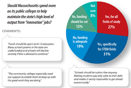 A recent report by the Massachusetts Technology Collaborative warned that the Bay State spends less per student on higher education. Meaning that, in the long run, we could be in danger of falling behind other states like ours that have a high concentration of jobs in “innovation” industries, but better fund higher education. For our poll during the week of Feb. 17, most respondents said the state’s public colleges deserve more money.