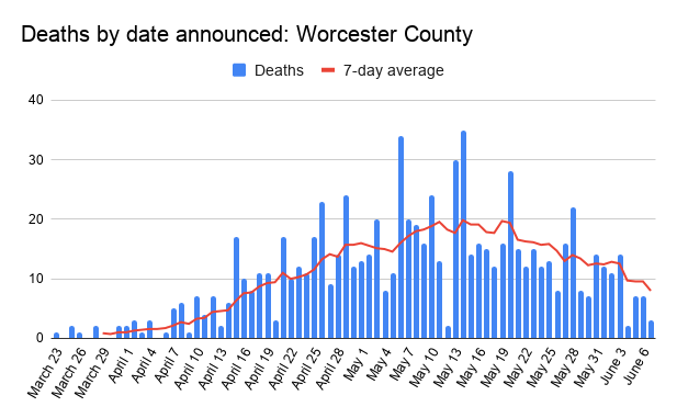 Worcester County’s seven-day average for coronavirus deaths has fallen into the single digits for the first time since April 20, continuing a promising downward trend for the region that had been slower to show improvement than much of the rest of the state.
