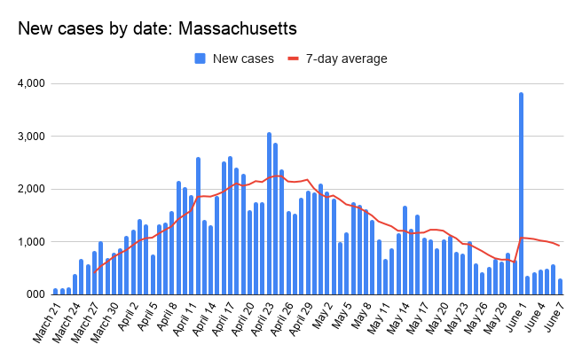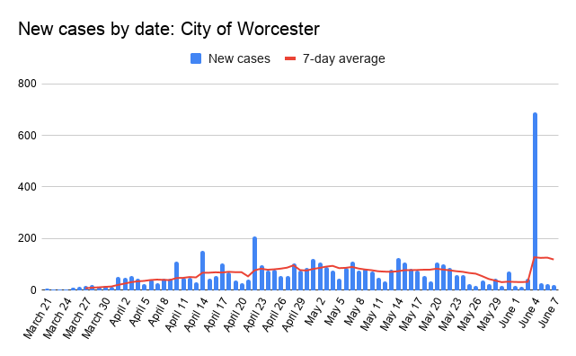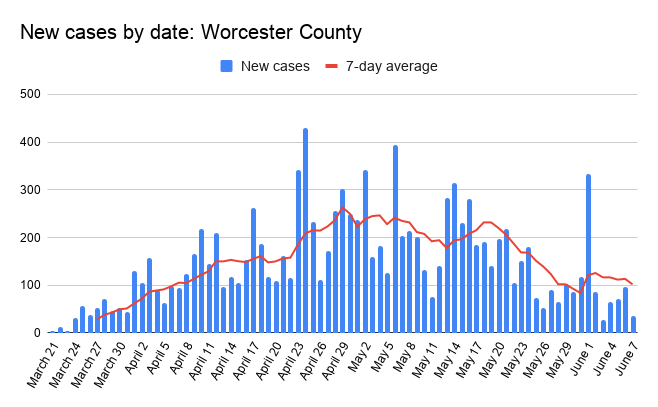 On Monday, Worcester County stood at 823 total deaths and 11,732 cases, according to the state. Across Massachusetts, those tallies stood at 7,316 deaths and 103,436 cases. The 304 new cases reported statewide Sunday was the lowest daily increase since March 23.