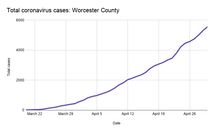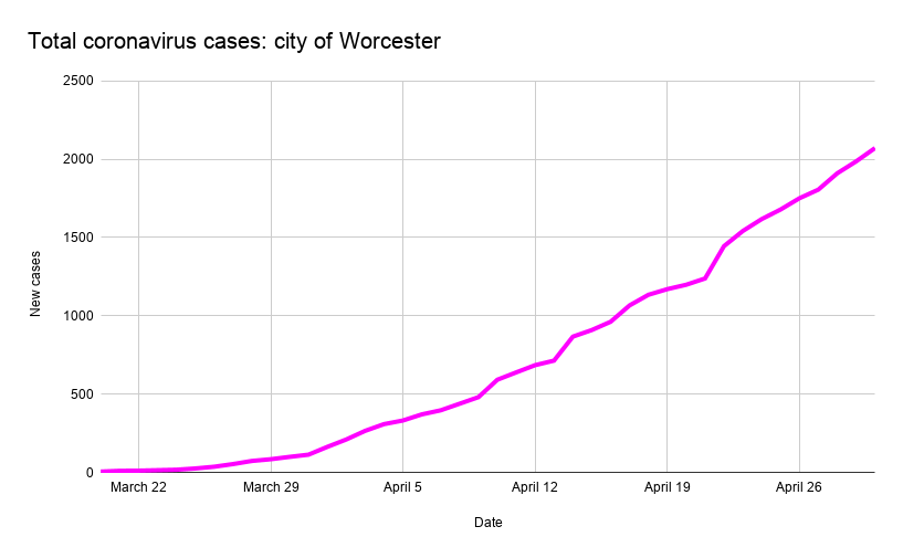 The City of Worcester surpassed 2,000 cases, hitting 2,071 Thursday. This is a 4% increase from Wednesday with 85 new coronavirus cases.