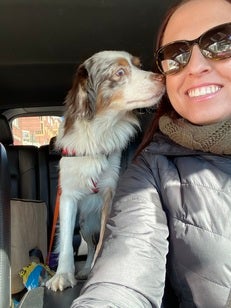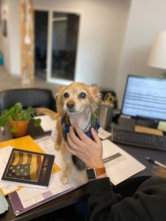 She adopted her dog Lucy from Vintage Pet Rescue, a rescue and hospice home for senior dogs out of Rhode Island, and is currently fostering a 15-year-old, toothless Chihuahua from Broken Tails.