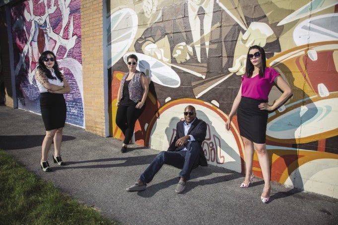 The effort to showcase the public art throughout Worcester in the 40 Under Forty issue was vital to the concept of a new Worcester, a city coming into its own as a happening place to be. With the help of Che Anderson from POW! WOW! Worcester, we were able to pinpoint the public murals on the WCUW building at the corner of Main and Hawthorne streets to show off Worcester’s public art scene while still allowing the four winners to shine in the photo and not get lost in a larger mural.