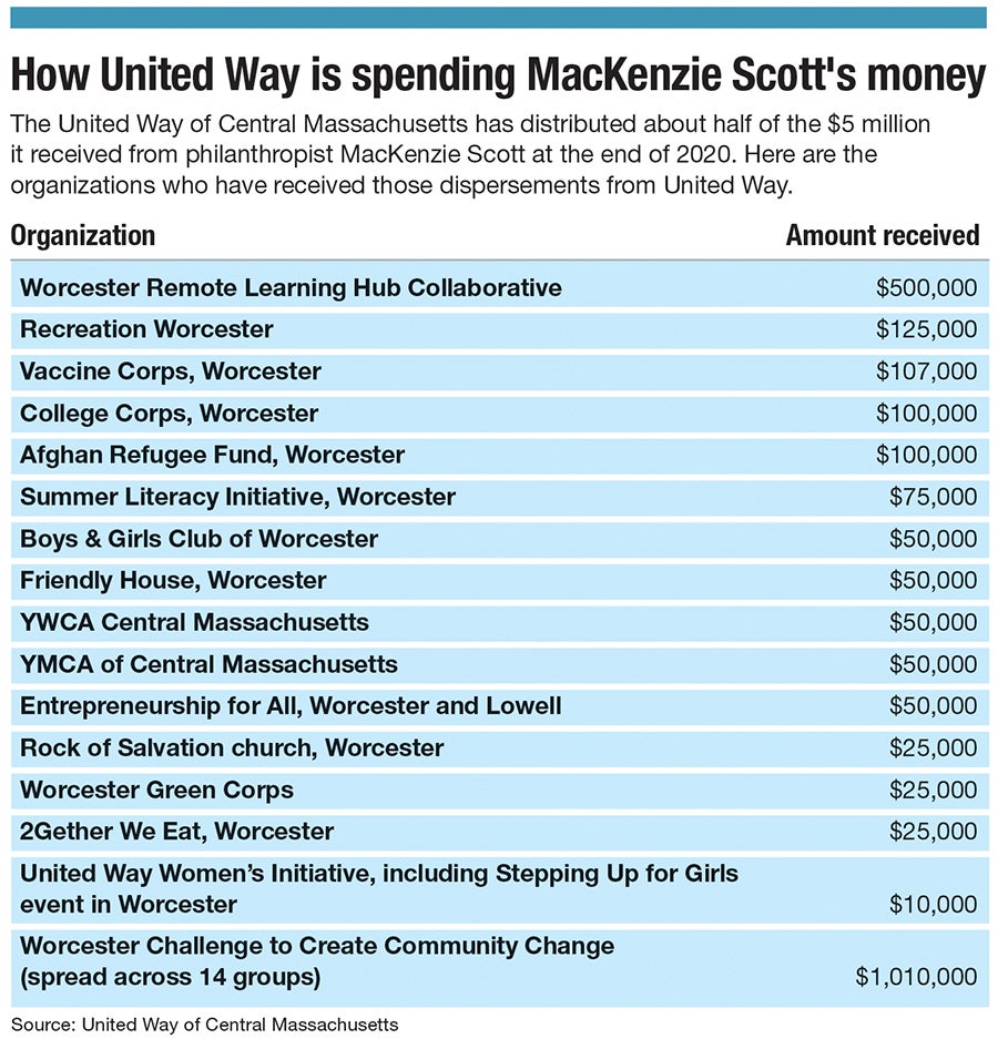 The person on the other end of the line – Hillary – explained to Garvin that Scott was in the process of donating a chunk of money, and she’d like to allocate some to the Central Massachusetts United Way. The gift, of a then-unspecified amount, Hillary said, would be unrestricted, a dream scenario for nonprofits. The only stipulations, she explained, would be Garvin not tell anybody until Scott announced the donation herself, and he needed to let Hillary know how United Way wanted to receive the money.