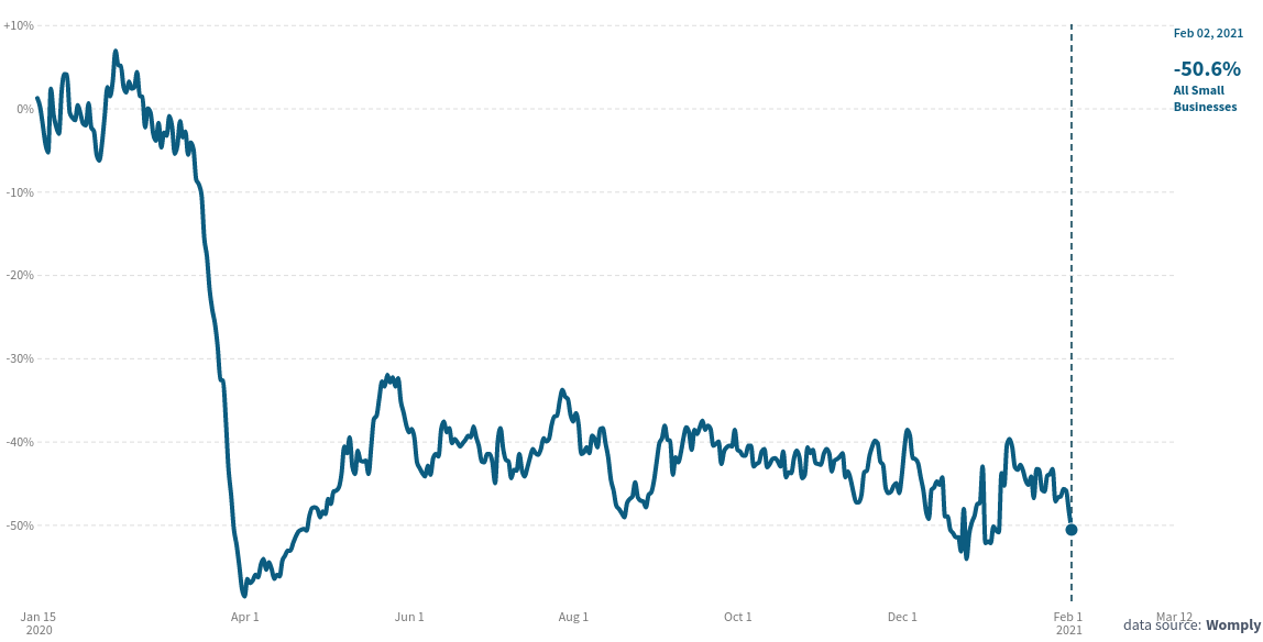 Average daily small-business revenue in Worcester County was down 51% through Feb. 2 compared to the average daily in January 2020, which was before the coronavirus pandemic hit, according to Opportunity Insights, an economic activity tracker run by a consortium including Harvard University in Cambridge and the Bill & Melinda Gates Foundation in Seattle.
