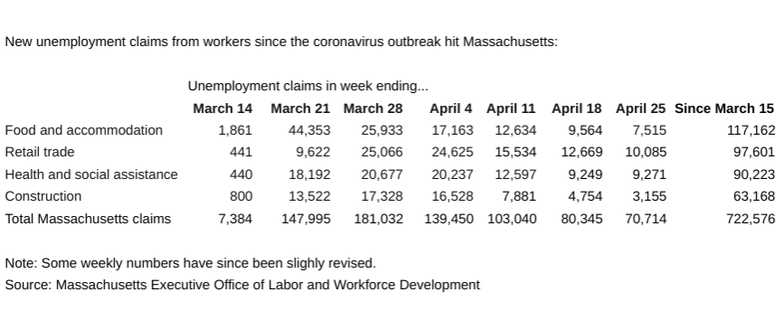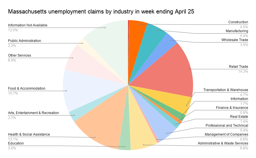 In the week ending April 25, claims in Massachusetts were highest in retail (10,085), food and accommodation (7,515), and health and social assistance (9,271), according to the Massachusetts Executive Office of Labor and Workforce Development.
