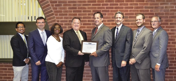 SpencerBANK was awarded Small Business Lender of the Quarter by the U.S. Small Business Administration for the third quarter of fiscal year 2015. Pictured, left to right, are: Carlos Hernandez, Ili Spahiu, Nadine Boone, and Robert Nelson, all SBA Massachusetts District executives; and Stephen Quink, Randal Webber, Timothy Gardell and Michael Quink of the SpencerBANK leadership team.