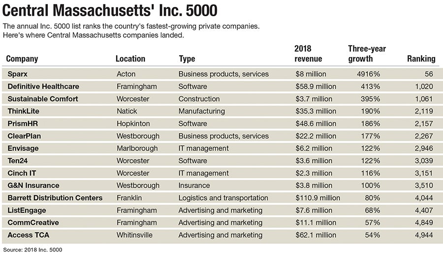 Definitive Healthcare, a Framingham health information services company, was 17th in Massachusetts and 1,020 nationally. Sustainable Comfort, a Worcester construction consultant, was 19th in the state and 1,061 nationally.