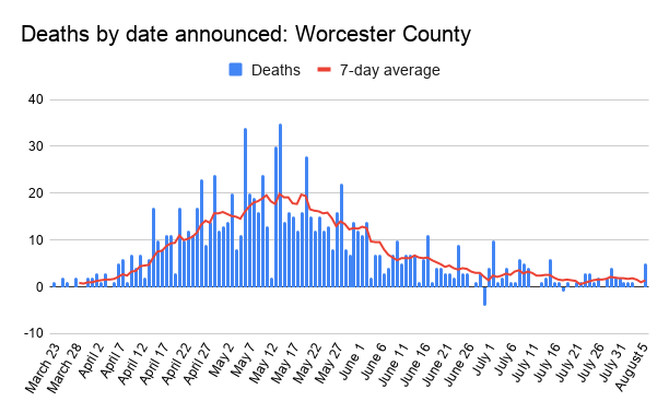 Fatalities in the county increased by 10 in the past week, with two consecutive days of no deaths on Aug. 4 and Aug. 5. The Worcester County death toll is now nearing 1,000, standing at 998 through Thursday.