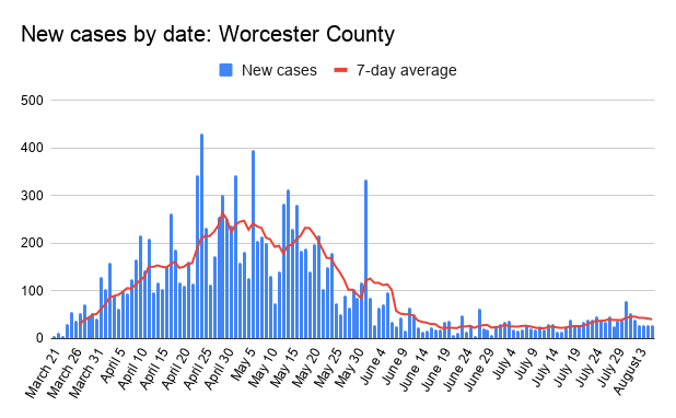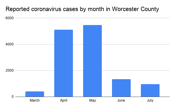 The new cases in Worcester County increased in July to 13,322 since the pandemic began. Statewide, cases increased by 8,730 in the month of July, increasing the total to 117,620.Â