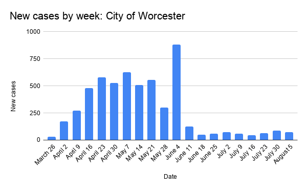 Between July 31 and Aug. 6, Worcester County coronavirus cases increased by 262, bringing the total to 13,525. Across the state, confirmed and probable cases increased by 2,776, with 119,882 overall. More specifically, there were 2,133 confirmed and 643 probable new cases.