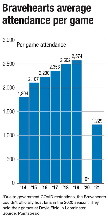 In 2021, the Bravehearts averaged 1,229 fans per game, less than half of that of 2019. A major contributor to this slough was the inability to sell group tickets to businesses and schools, due to remote work and learning.