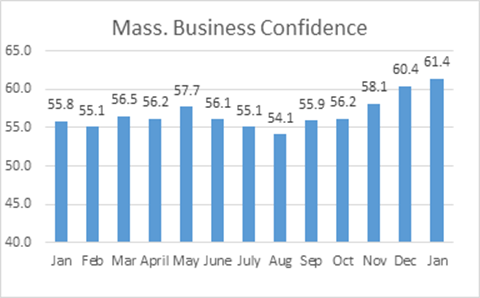The confidence increase came during a month when the Massachusetts unemployment rate fell to 2.8 percent and Bay State employers created more than 72,000 new jobs for the year. Meanwhile, national economic growth slowed to an annual rate of 1.9 percent during the final three months of 2016, while the Massachusetts economy downshifted to a 0.5-percent growth rate, down from 3.1 percent during the third quarter.