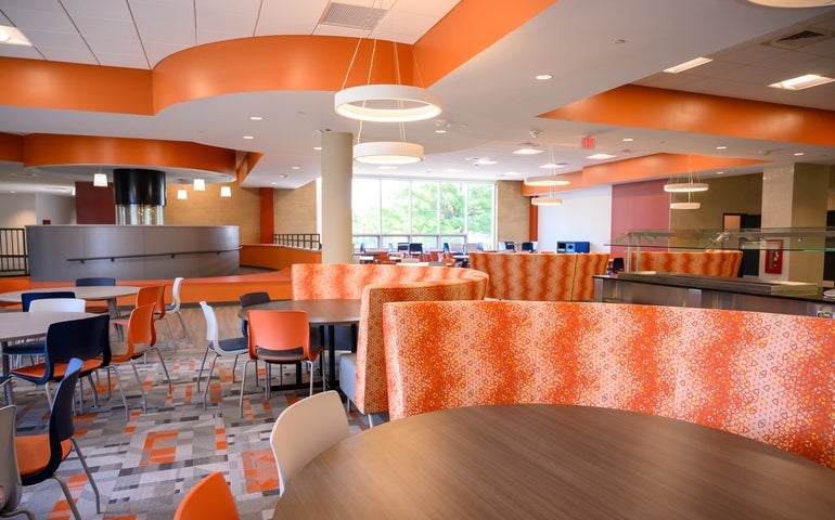 The campus center is the hub of the small Paxton campus, with a dining hall, book store and student services offices.