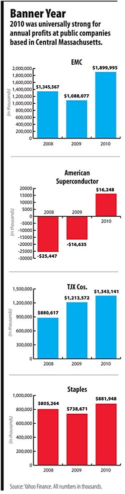 There was similar good news at other Central Massachusetts-based corporate headquarters, including Framingham-based Staples, where profits shot up 19 percent to $881 million last year.