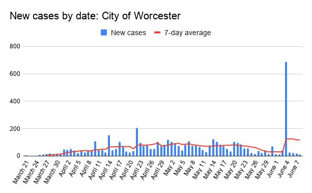 The City of Worcester reported 13 new cases, which increased the overall number in the city to 5,031.