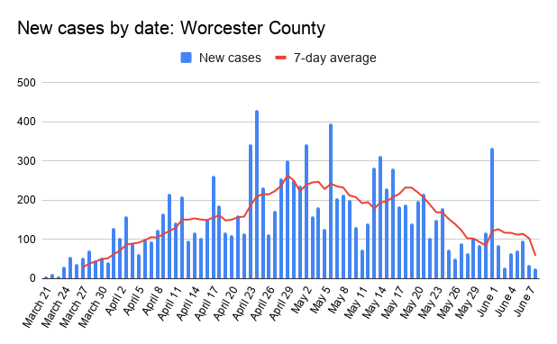 Fatalities newly reported bring the total to 827 in Worcester County. Throughout Massachusetts, there were 38 new confirmed fatalities adding to the 7,353 total.