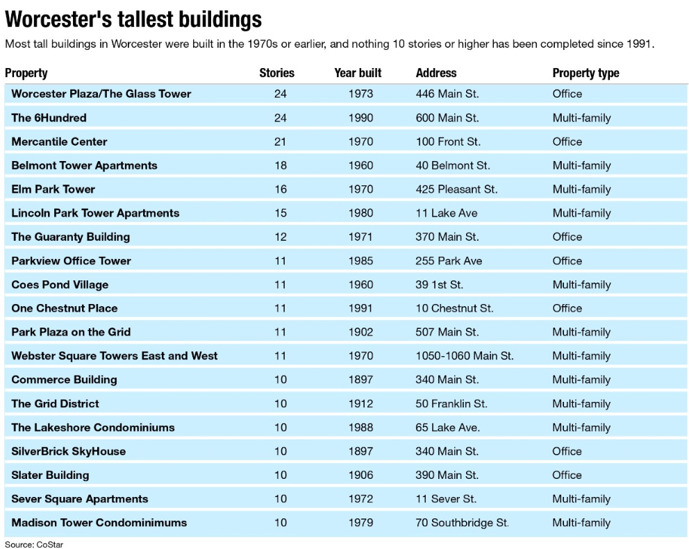 Of course, Worcester does have some tall buildings. But of the 19 buildings rising 10 stories or more, the newest were built at the start of the 1990s and most date to the 1970s or earlier.