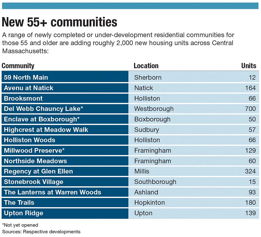 Communities built exclusively for those 55 or older are on the rise in Central Massachusetts, with a combined more than 2,000 units either underway or just completed. They almost always have a few things in common: Common spaces and amenities meant to foster a sense of community, and a lack of big yards requiring a lot of upkeep.