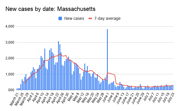 Worcester County had a reported 234 new coronavirus cases and six fatalities between July 17 and Thursday, according to the Massachusetts Department of Public Health.