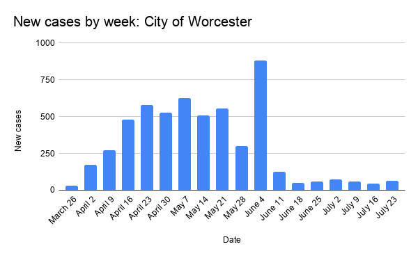 The City of Worcester reported 63 new cases in the past week, with 5,414 overall since the pandemic’s start. The next coronavirus update will be made on Thursday.