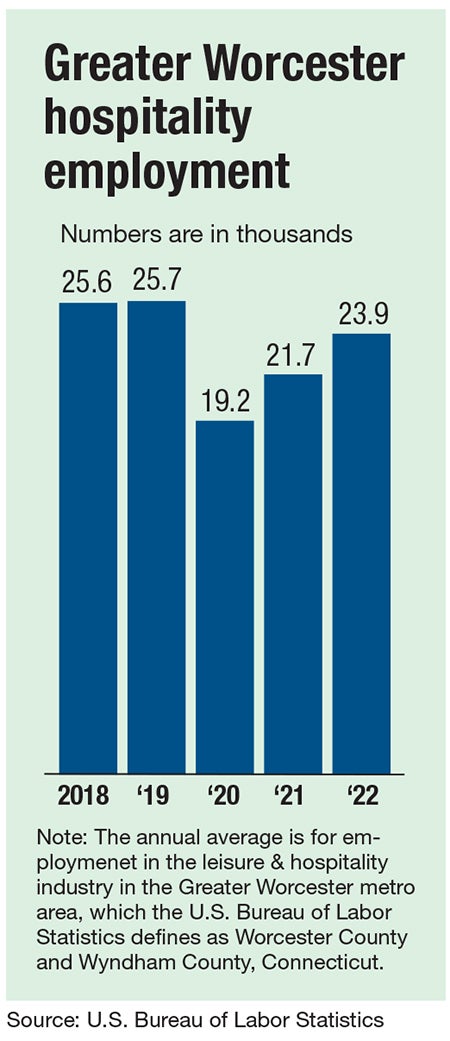 In 2022, the leisure and hospitality workforce in the Greater Worcester metro area rose to an 23,925 average for year, closing in on the pre-pandemic level of 25,700 set in 2019, according to the U.S. Bureau of Labor Statistics. BLS defines the metro area as Worcester County and Wyndham County, Connecticut.