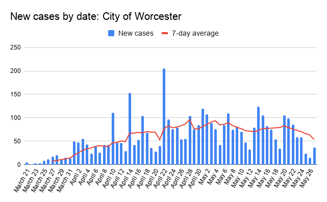 Reported fatalities in Worcester County increased to 716 due to the new deaths on Wednesday, and throughout Massachusetts there were 74 new fatalities, bringing the death toll to 6,547.
