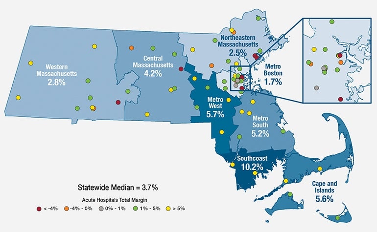 All but two of the acute-care hospitals in Central Massachusetts were profitable last year, pushing the overall margin for the region to fourth best out of the seven regions in the state, according to a report by the Massachusetts Center for Health Information and Analysis (CHIA).