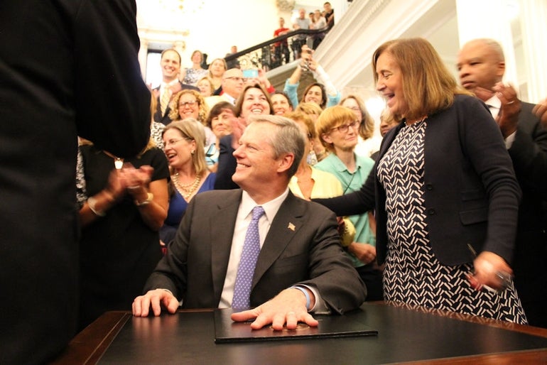 Baker signed the bill with Lt. Gov. Karyn Polito, cabinet secretaries Marylou Sudders and Kristen Lepore, Treasurer Deborah Goldberg, Auditor Suzanne Bump, former Lt. Gov. Evelyn Murphy, about two dozen lawmakers, Senate President Stan Rosenberg, and House Speaker Robert DeLeo by his side.
