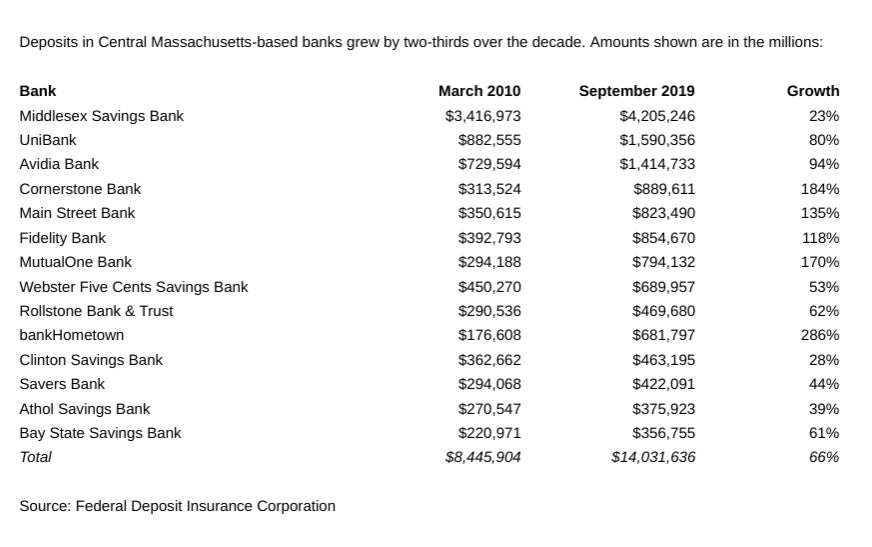 Worcester’s Cornerstone Bank was second with deposits totaling $890 million over the last 10 years, a 184% rise.