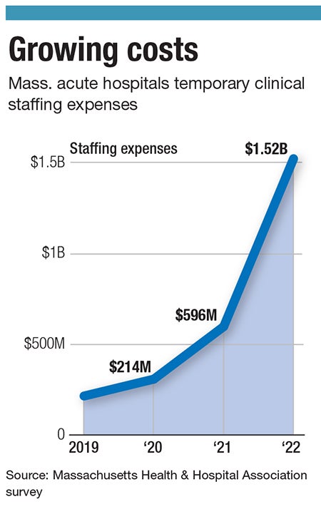 In 2022, hospitals spent $1.3 billion more for temporary staffing than they did in 2019, according to a Massachusetts Health & Hospital Association survey of hospitals representing nearly 90% of staffed inpatient beds in Massachusetts. More than three-quarters of the temporary staffing spend was on nurses, according to the study.