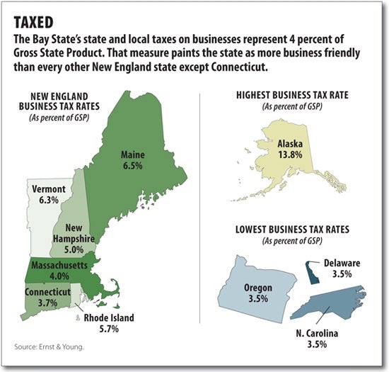 MassBudget cites a study conducted by Ernst & Young for the Council on State Taxation for fiscal 2009 that shows business taxes making up 4 percent of gross state product. That compares favorably to the U.S. average of 4.7 percent and leaves just eight states taxing less than Massachusetts.
