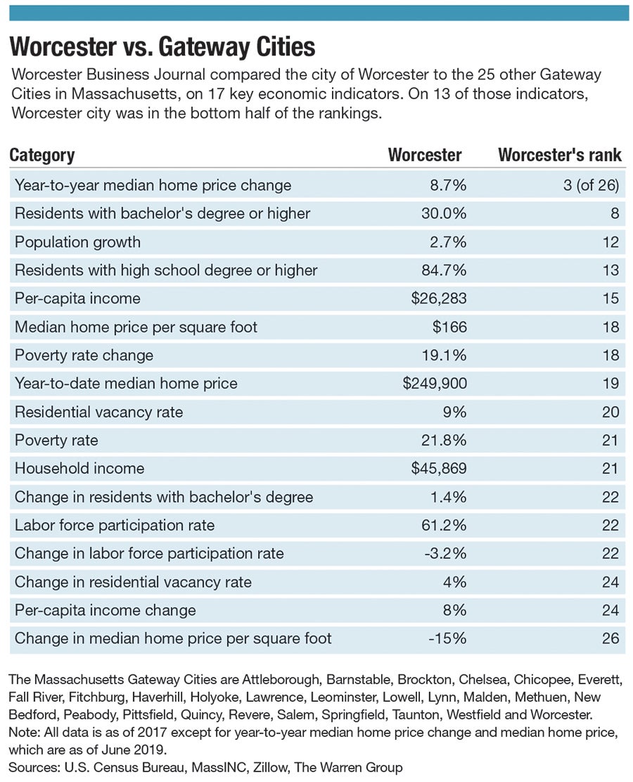 New to study this year is an effort to further understand the economic growth within the region, so WBJ compared data exclusively inside the city of Worcester against the 25 other Massachusetts Gateway Cities. That analysis looking strictly at what is going on economically within city limits shows Worcester city below average in 13 of the 17 categories, ranking last or near last for metrics like household income, poverty rate, labor force participation and changes in the per square foot price of homes.