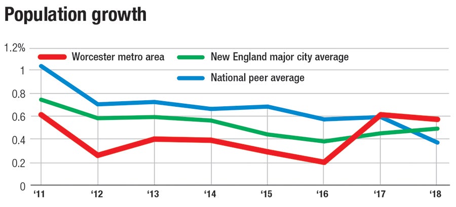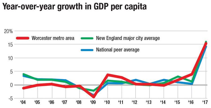 In an update of that WBJ study this year, the results show Greater Worcester is starting to make up the ground it lost from being behind the pack since the end of the Great Recession, by outpacing its national and regional peers in each of the last two years. Like last year, WBJ is using the U.S. Census Bureau definition of the Greater Worcester metro area, which includes Worcester County and Windham County, Conn.