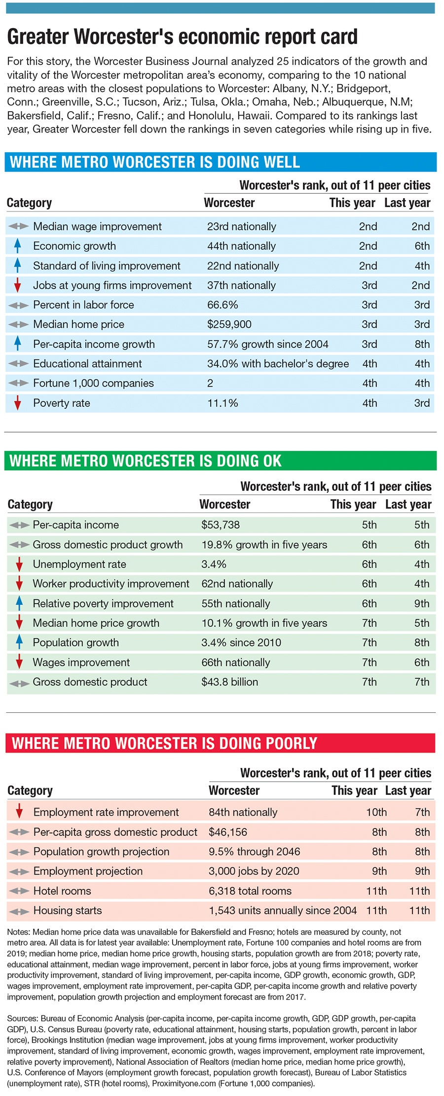 In all, WBJ analyzed Greater Worcester in 25 economic indicator categories against the 10 U.S. metro areas with the most similar populations: Albany, N.Y.; Bridgeport, Conn.; Greenville, S.C.; Tucson, Ariz.; Tulsa, Okla.; Omaha, Neb.; Albuquerque, N.M; Bakersfield, Calif.; Fresno, Calif.; and Honolulu, Hawaii. In a separate comparison, WBJ measured Greater Worcester against the other major New England metro areas: Boston, Providence, Springfield, Hartford, Manchester, N.H. and Portland, Maine.