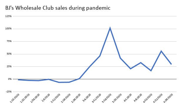BJ’s, which has 218 stores, saw sales double at one point in March compared to a year ago, according to previously reported data by the industry tracker Earnest Research. Earnest’s data showed sales spiking beginning in early March and continuing at at least a one-fourth increase over last year through late April.