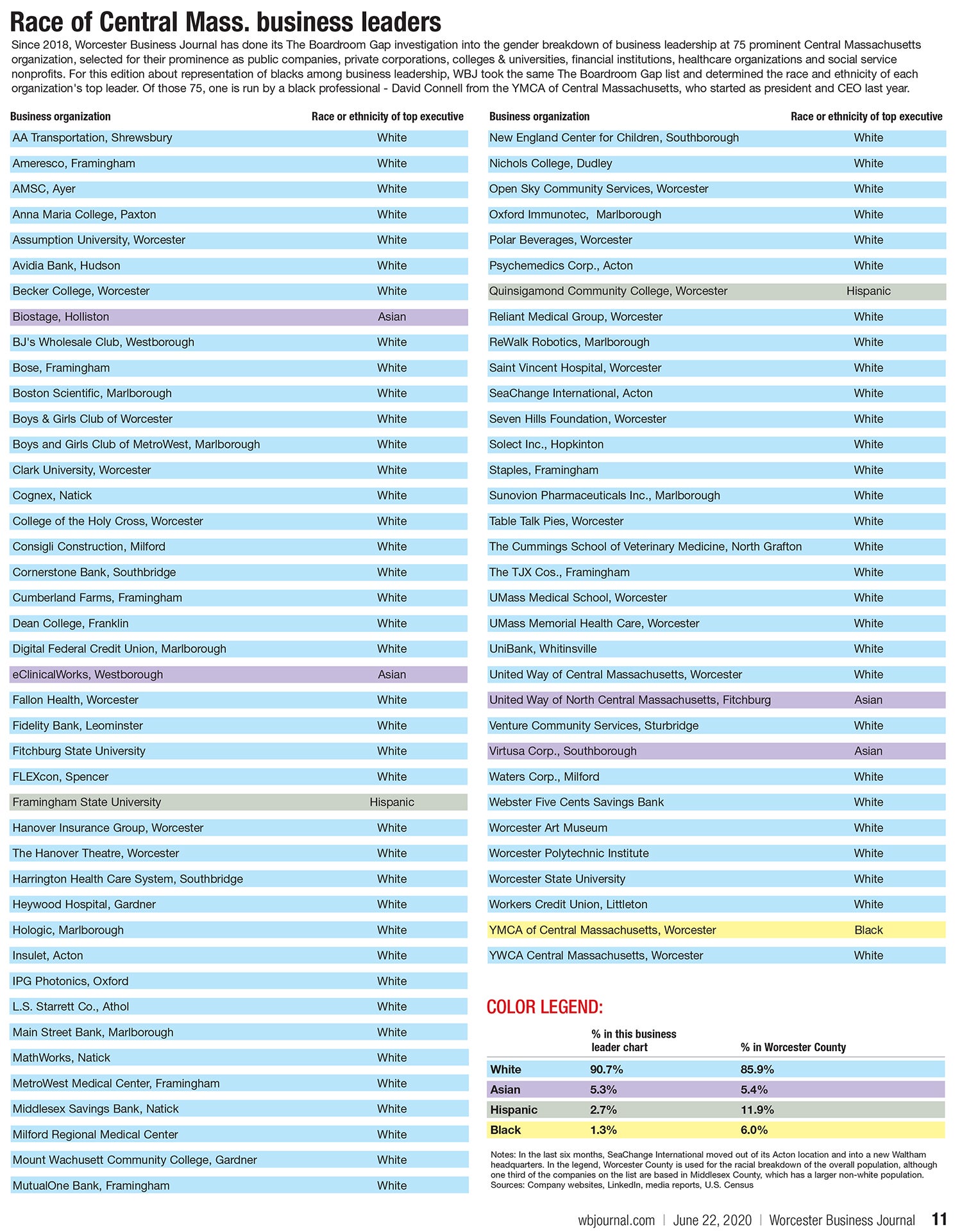 Only one of the leaders of those business organizations – YMCA of Central Massachusetts President and CEO David Connell — is black. A few other black leaders in Central Massachusetts lead organizations not featured on The Boardroom Gap list, including Lou Brady, the president and CEO of Family Health Center of Worcester. Both Connell and Brady were appointed to their positions in 2019.