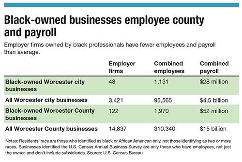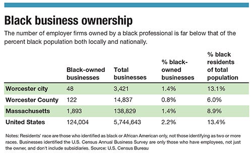 In Worcester city, 1.4% of businesses with employees are black-owned, despite the city’s population being 13.1% black, according to the census.