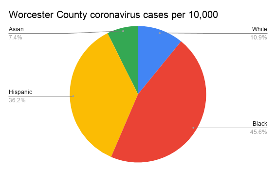 Black and Hispanic residents in Worcester County have been infected by coronavirus at proportions multitudes higher than white residents, according to data from the U.S. Centers for Disease Control and Prevention.
