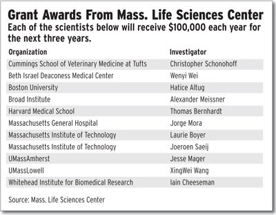 As National Institutes of Health research funding has flattened out, making it harder for young investigators to get research grants, the Massachusetts Life Sciences Center has awarded $3.1 million to 11 researchers around the state. The funding represents that first grant awards since the state approved its $1 billion life sciences initiative.