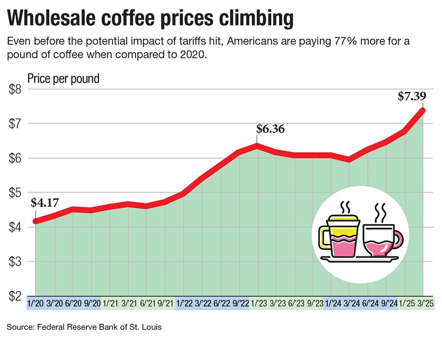 Consumer coffee prices have climbed dramatically in the past five years, from $4.17 per pound in January 2020 to a peak of $7.39 in March 2025, according to data from the Federal Reserve Bank of St. Louis.