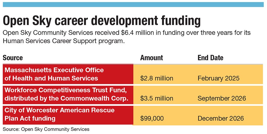 The Human Services Career Support Program, a collaborative initiative between Open Sky Community Services and Seven Hills Foundation, is a five-month, paid training program offering participants guaranteed employment at one of the two Worcester human service nonprofits upon graduation.