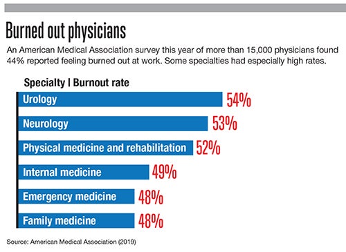 Roughly half of physicians in some fields said in an American Medical Association survey they felt burnout, including those in urology, neurology, internal medicine, emergency medicine and family medicine.