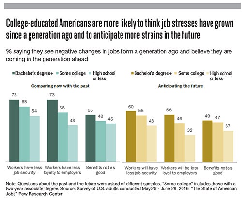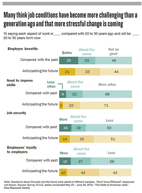 A majority of Americans (63%) believe jobs are less secure now than they were 20 to 30 years ago, and 51% anticipate jobs will become less secure in the future, according to a 2016 Pew Research Center poll.
