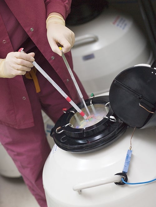 The assisted-fertility process of freezing ovarian eggs is also known as egg vitrification. First, six to 10 eggs are harvested from a patient’s ovaries, dehydrated, put into liquid nitrogen and stored at minus-196 degrees Celsius. When the patient is ready — months or years later — the eggs are fertilized and put back into the uterus as embryos, ideally resulting in a viable, healthy pregnancy.