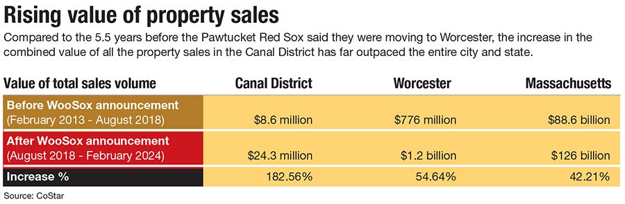 Interest in purchasing Canal District real estate has spiked 72%. In the 5.5 years since the 2018 WooSox announcement, the neighborhood had 86 property sales, compared to 50 sales in the 5.5 years before the announcement, according to City property records.