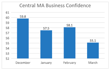 The Central Massachusetts Business Confidence Index recorded a 55.1 measurement for March, down from 58.1 in February, according to a Monday press release from the Worcester Regional Chamber of Commerce.