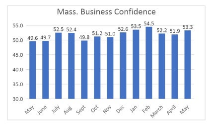 The Central Massachusetts Business Confidence Index, rose from 45.9 in April to 50.6, according to a press release from trade group Associated Industries of Massachusetts on Thursday.