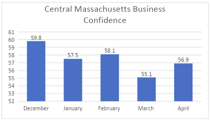 The Central Massachusetts Business Confidence Index rose to 56.9 in April, up from 55.1 in March, which was the lowest confidence had been in 2022.